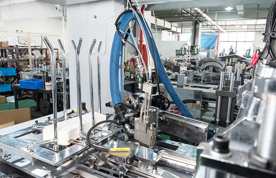 该设备适用于 4 至 16 盎司的杯子,每分钟生产速度为 80 至 100 个。它配备了旋转吸纸、焊接封口、底部加热和折叠功能、自动单层杯卸料装置以及伺服胶合装置,能够轻松实现双层杯子的生产。它采用 PLC 控制系统和触摸屏,操作简便。如果出现故障,它会自动运行,从而显著提高稳定性和后续工作效率。