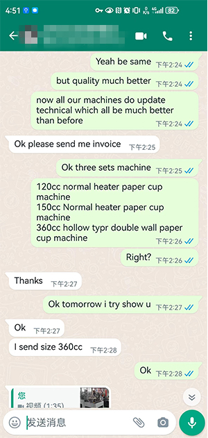 Client need buy two sets Normal Heater single wall paper cup machine 120ML and 150ML, and one sets Ripple Type double wall paper cup machine forming 360ML.