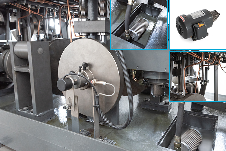 油润滑与循环 整机采用自动油润滑系统(油循环系统包括油马达、过滤器、铜管),使各齿轮运动部件在高速运转时更加平稳,大大提高了零件的使用寿命 |